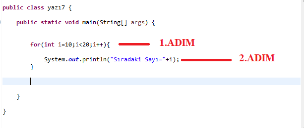 - Döngünün başlangıç ve bitiş değerlerini belirledikten sonra System.out.println komutu sayesinde sırayla Console kısmına yazmasını sağlamış olduk.
