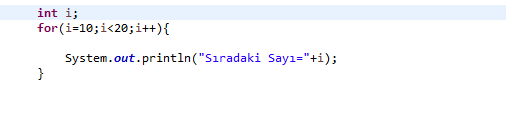 - i=10 ile başlattık, i<20 değeri de bizim bitiş değerimizi gösterdi. Yani sayı değerimiz 10’dan başlayacak 20’den küçük olana kadar devam edecek.