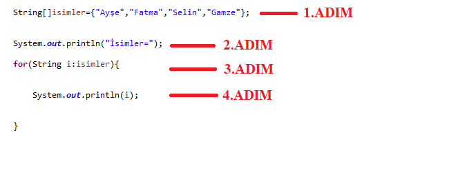 - 3.adımda öğrendiğimiz döngüyü -dizimiz String dizisi olduğu için string olarak tanımladık- i sayacıyla koşulumuzu gerçekleştirmiş oluyoruz.