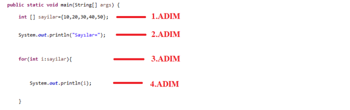 - 4.adımda System.out.println yardımıyla dizideki değerleri sırasıyla okuyan i değerimizi yazdık. Böylece konsola sırasıyla dizi değerlerimizi yazabileceğiz.