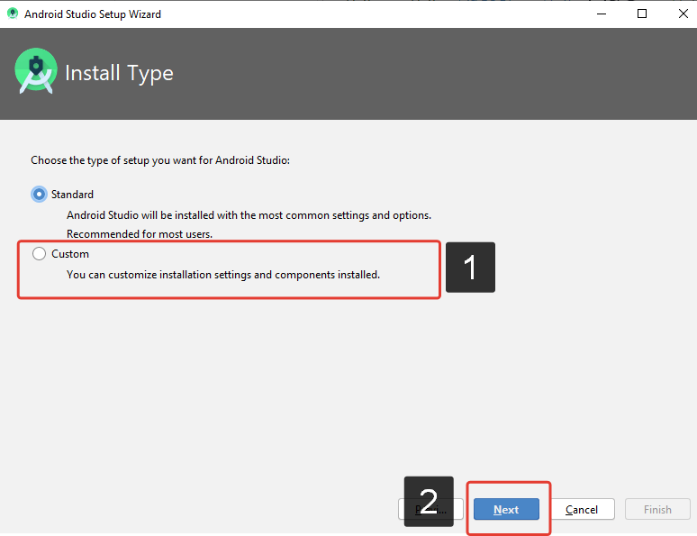 - Eğer Android Studio’ya eklenebilecekleri manuel seçmek istiyorsak Custom seçeneğini seçip next seçeneğine tıklıyoruz, eğer ayarların standart bir şekilde yüklenmesini istiyorsak Standard seçeneğini seçebiliriz. Ben Custom seçeneğini seçip ilerlemeyi gösteriyor olacağım.