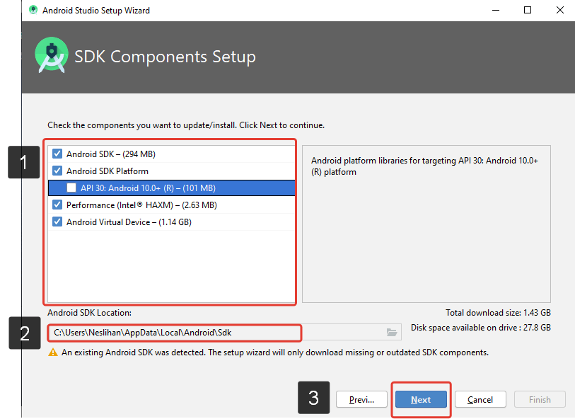 - Açılan sekmede solda bulunan tüm kutucukları tikledikten sonra, aşağıda SDK dosyasının kurulum yerini bizlere sunmakta. Eğer sunduğu dosya adında Türkçe karakter ya da dosya isminde boşluk varsa dosyanın içerisine giderek değiştirmeniz gerek. Eğer değiştirmezseniz program yazarken bolca sorunla karşılaşabilmeniz mümkündür. Burada herhangi bir sorun yoksa next deyip ilerleyebiliriz.