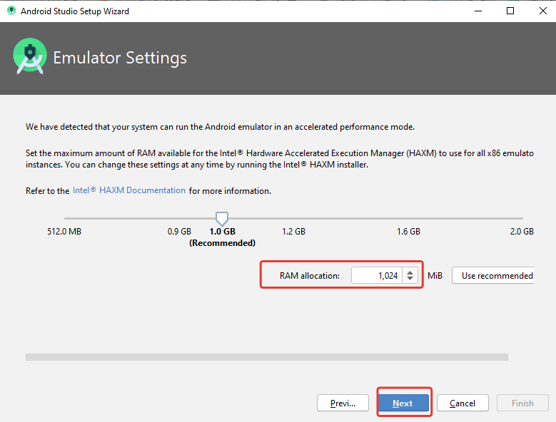 - Açılan sayfada kullanılacak emülatörün RAM’de ne kadar yer kaplamasını istediğimize göre seçim yapıp ilerlememiz gerekiyor. Genelde bu sayfada bilgisayarın hafızasına göre önerilen seçeneği bizlere sunuyor Android Studio. Burada hafızadan fazla bir kapasite seçersek program içerisinde yavaşlık yaşayabilmemiz mümkün.