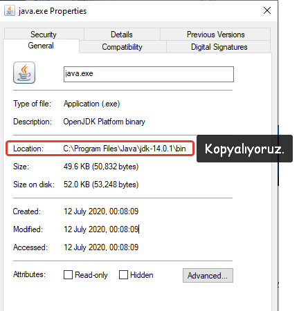- Daha sonra indirdiğimiz programın indirildiği klasörü buluyoruz. (Benim bilgisayarımdaki bağlantı şu şekildeydi: C:\Program Files\Java)